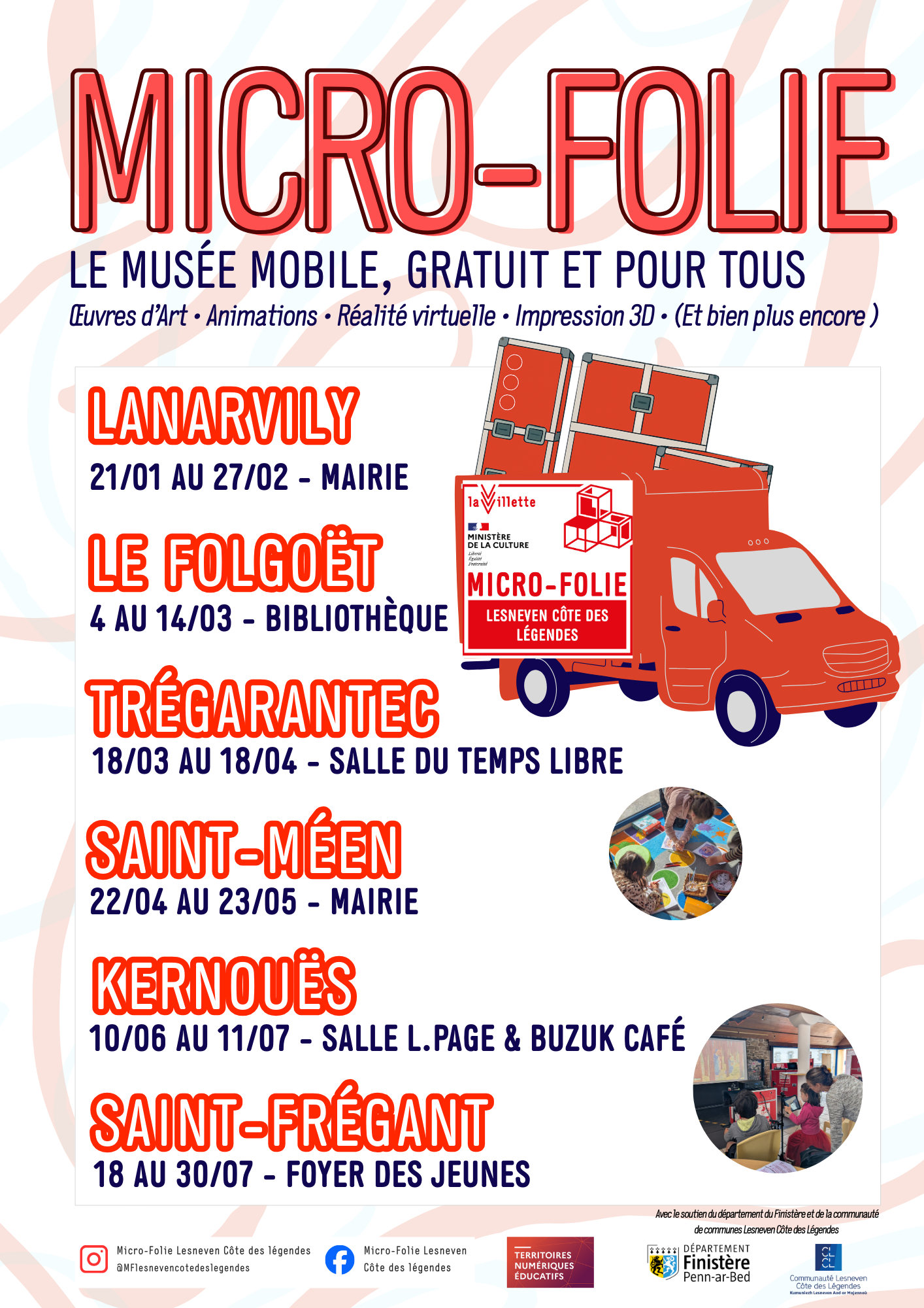 Sur notre territoire, la mise en place de la Micro-Folie mobile Lesneven Côte des Légendes est le fruit d’une coopération entre les communes de St-Frégant, Lanarvily, Trégarantec, Kernouës, Guisseny, Le Folgoët, Saint-Méen qui se sont associées à Lesneven, ville porteuse du projet, pour créer ce nouveau service itinérant dont la première tournée démarrera en septembre 2025